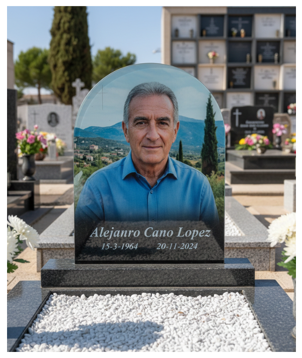 A diferencia de las losas de granito tradicionales, esta lápida de cristal aporta luz y profundidad al lugar de descanso. La transparencia del material permite que la imagen del fallecido se vea con una nitidez impresionante, creando una atmósfera de paz y serenidad.