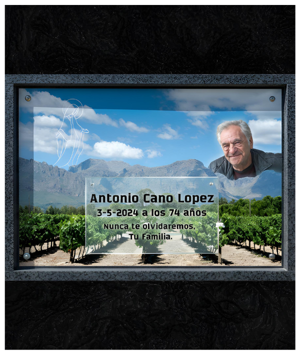 Este formato de 80×60 cm está diseñado para funcionar como el cierre frontal del nicho, transformando el espacio en un lugar solemne y luminoso. Es una pieza de arte funerario contemporáneo que sustituye o cubre la lápida tradicional.